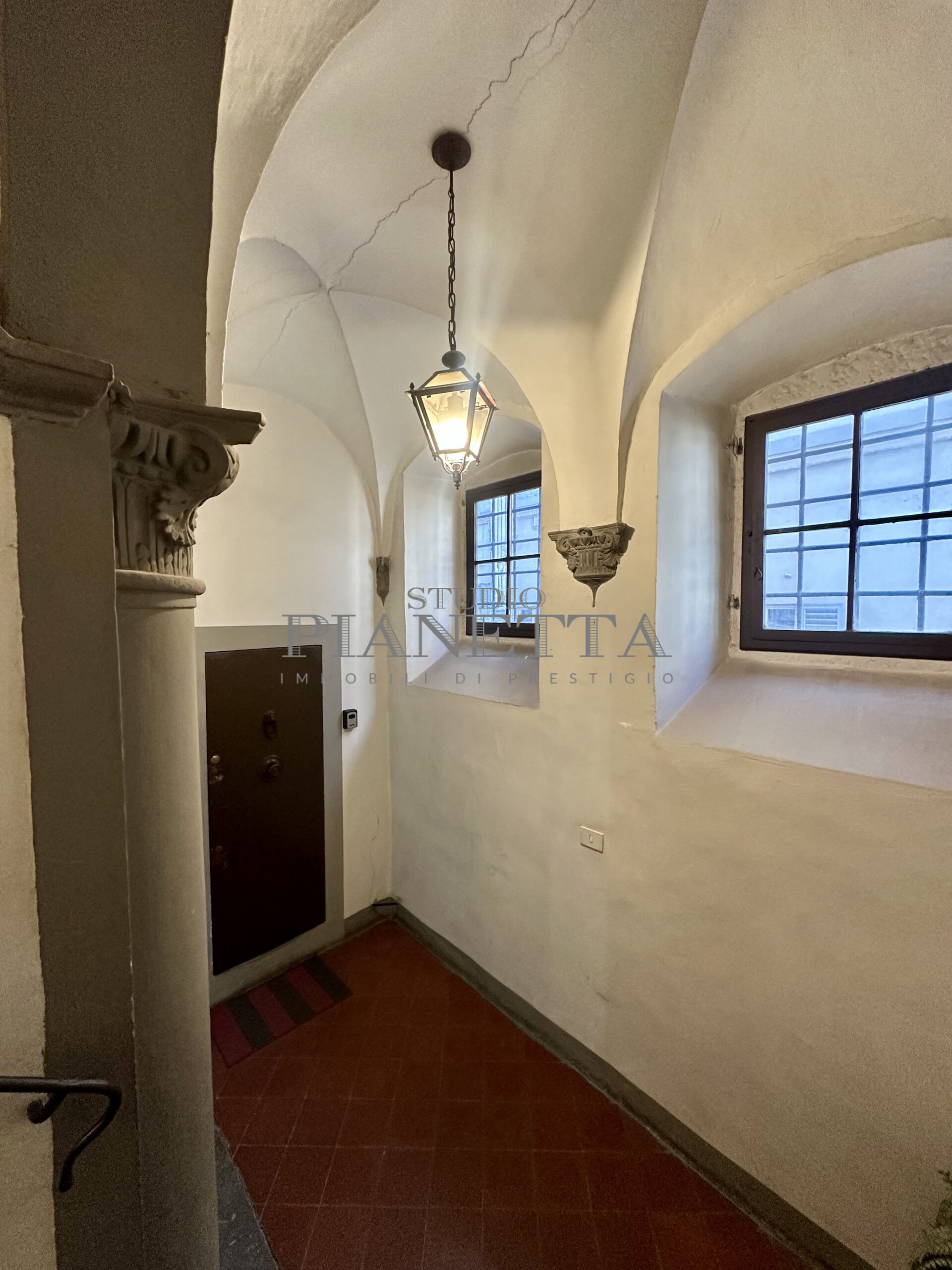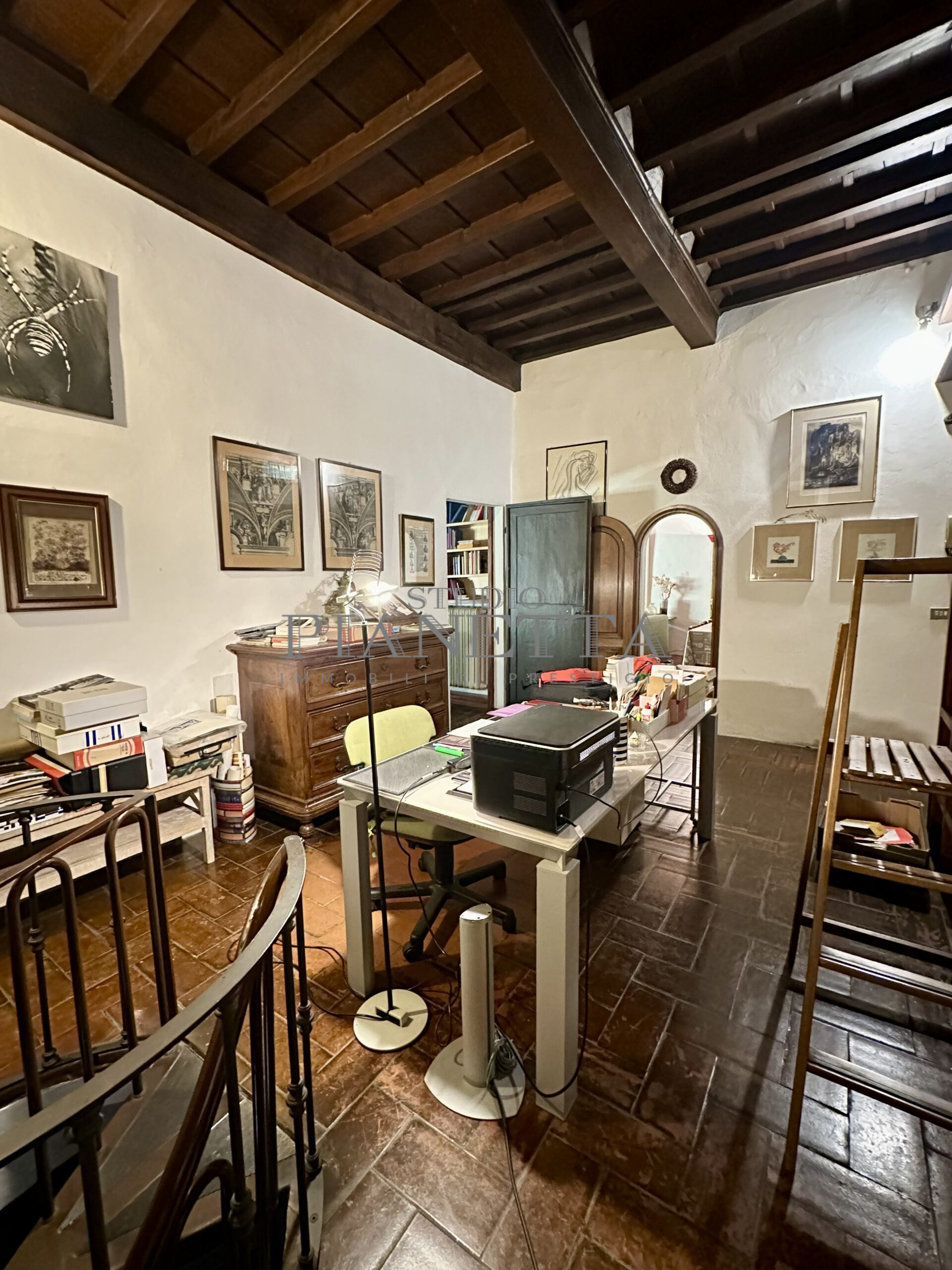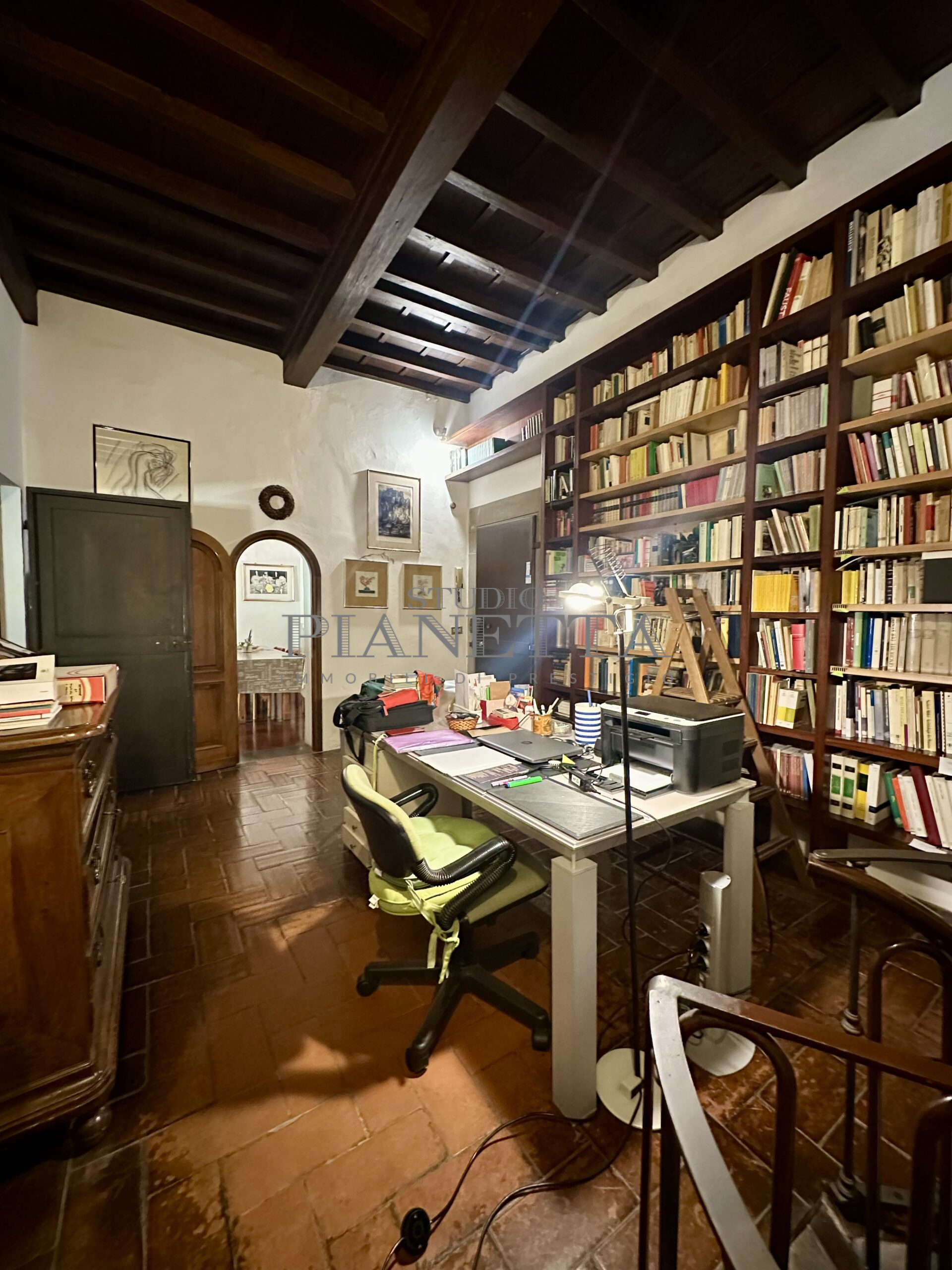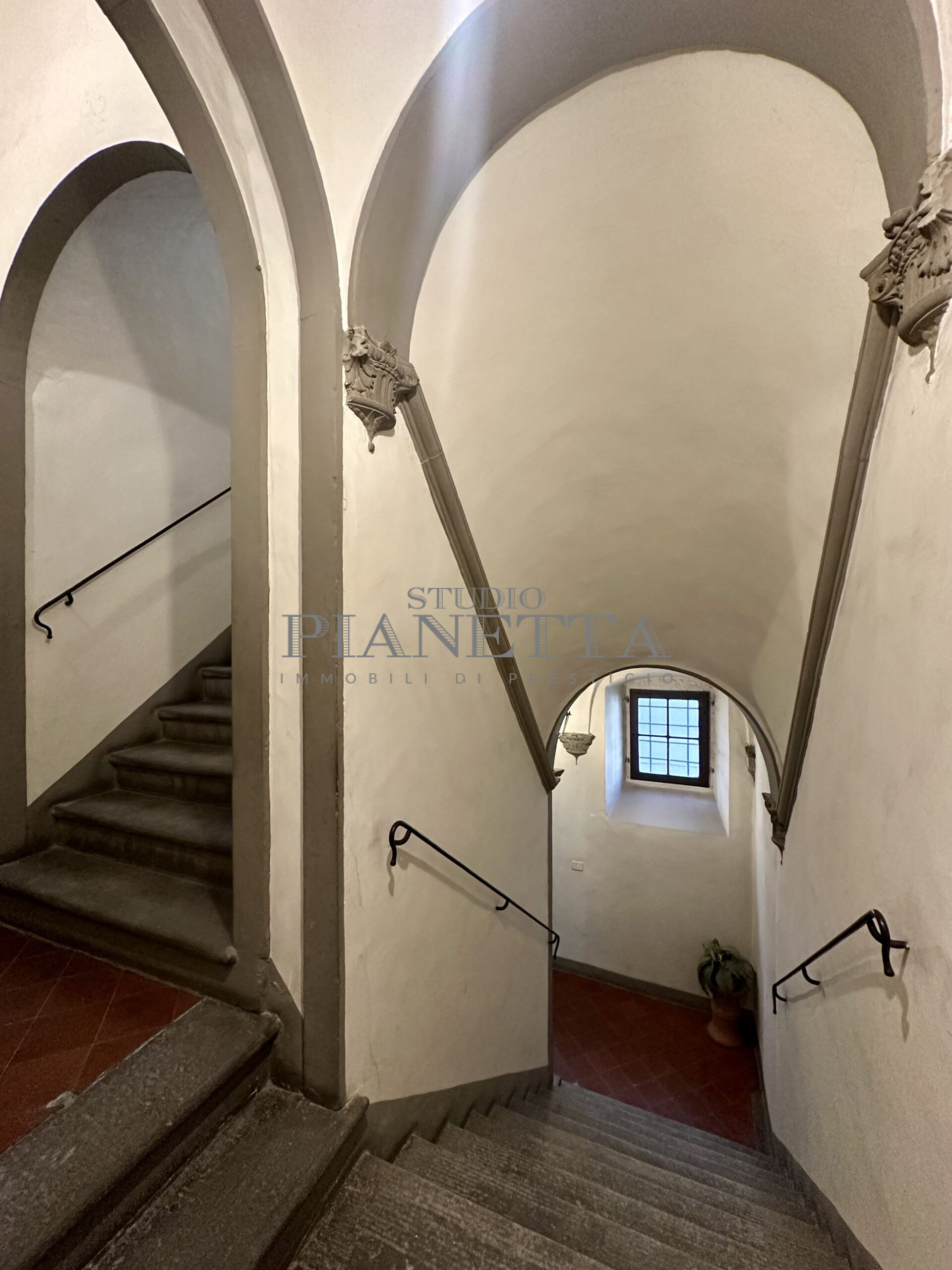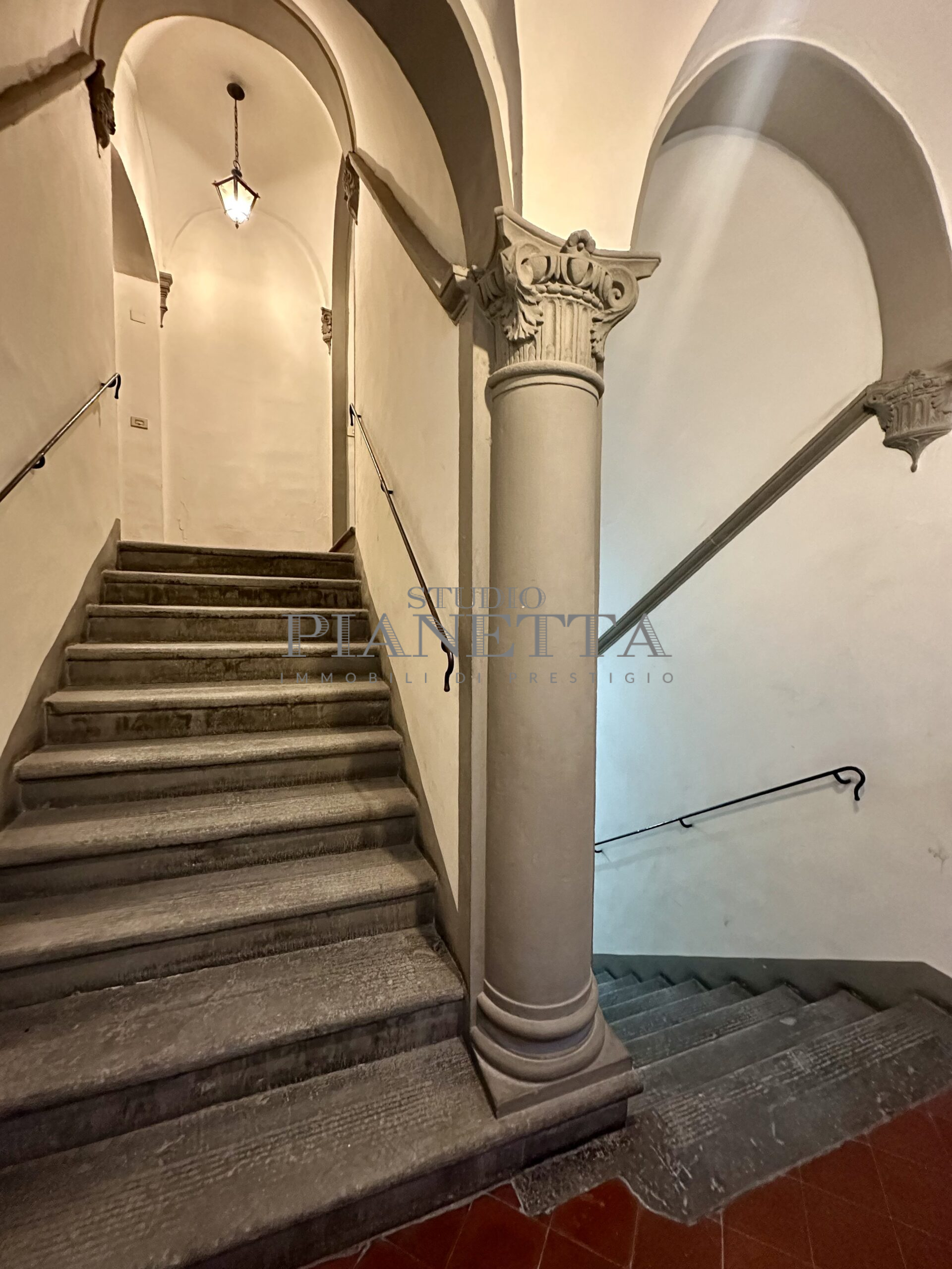 Oltrarno, in palazzo della Firenze granducale appartenuto ad un famoso architetto mediceo, al secondo e ultimo piano senza ascensore con comode e larghe scale in pietra serena, con capitelli e colonne ornate, importante appartamento della grandezza di 200 mq circa distribuiti su tre livelli con triplo ingresso. Gli ambienti sono grandi, caratteristici, con cotto antico e antichi soffitti a cassettoni. I salotti sono tre di cui due attualmente adibiti a grandi studi ma convertibili in camere, una piccola e intima sala da pranzo, una cucina e un bagno. Al piano mezzanino si trova un’ulteriore camera indipendente con accesso separato, mentre ad un altro ampio vano di passaggio si accede al piano superiore dove troviamo due camere da letto matrimoniali e un bagno en suite. L’appartamento e’ corredato anche da una grande soffitta praticabile. L’appartamento si presenta in buone condizioni di manutenzione.