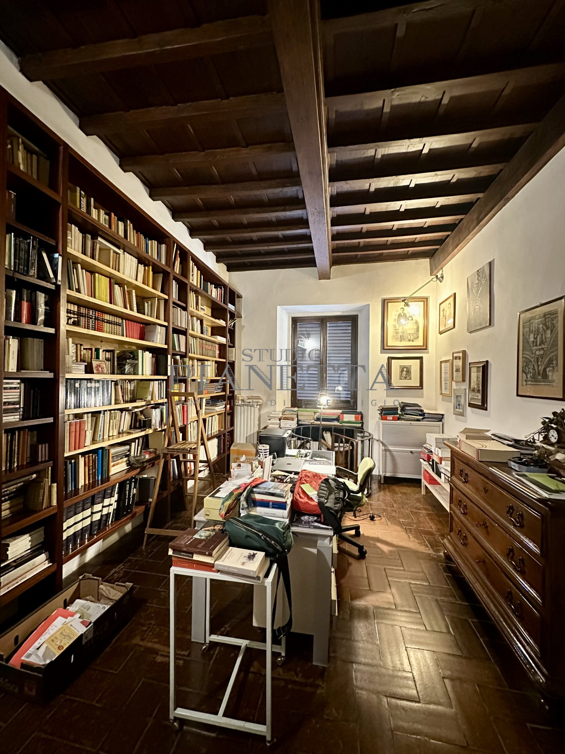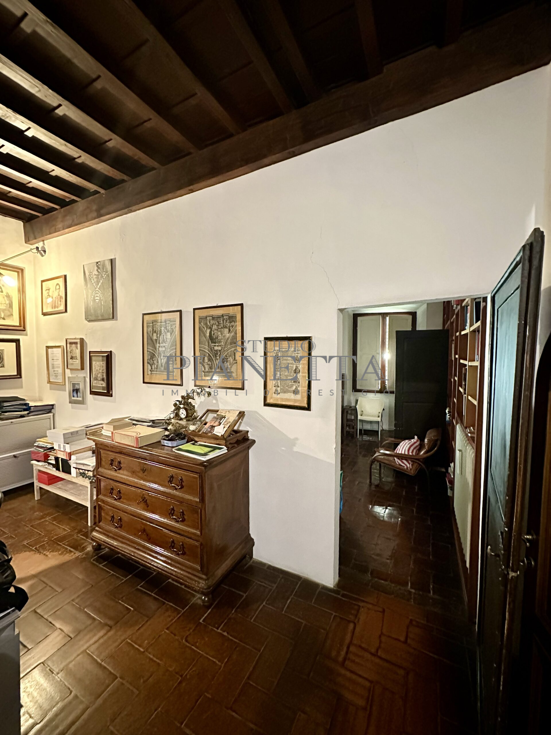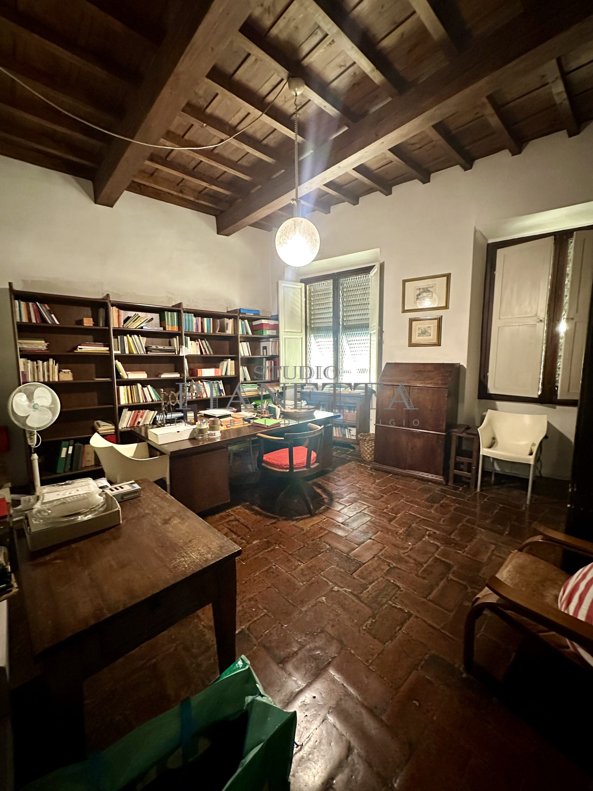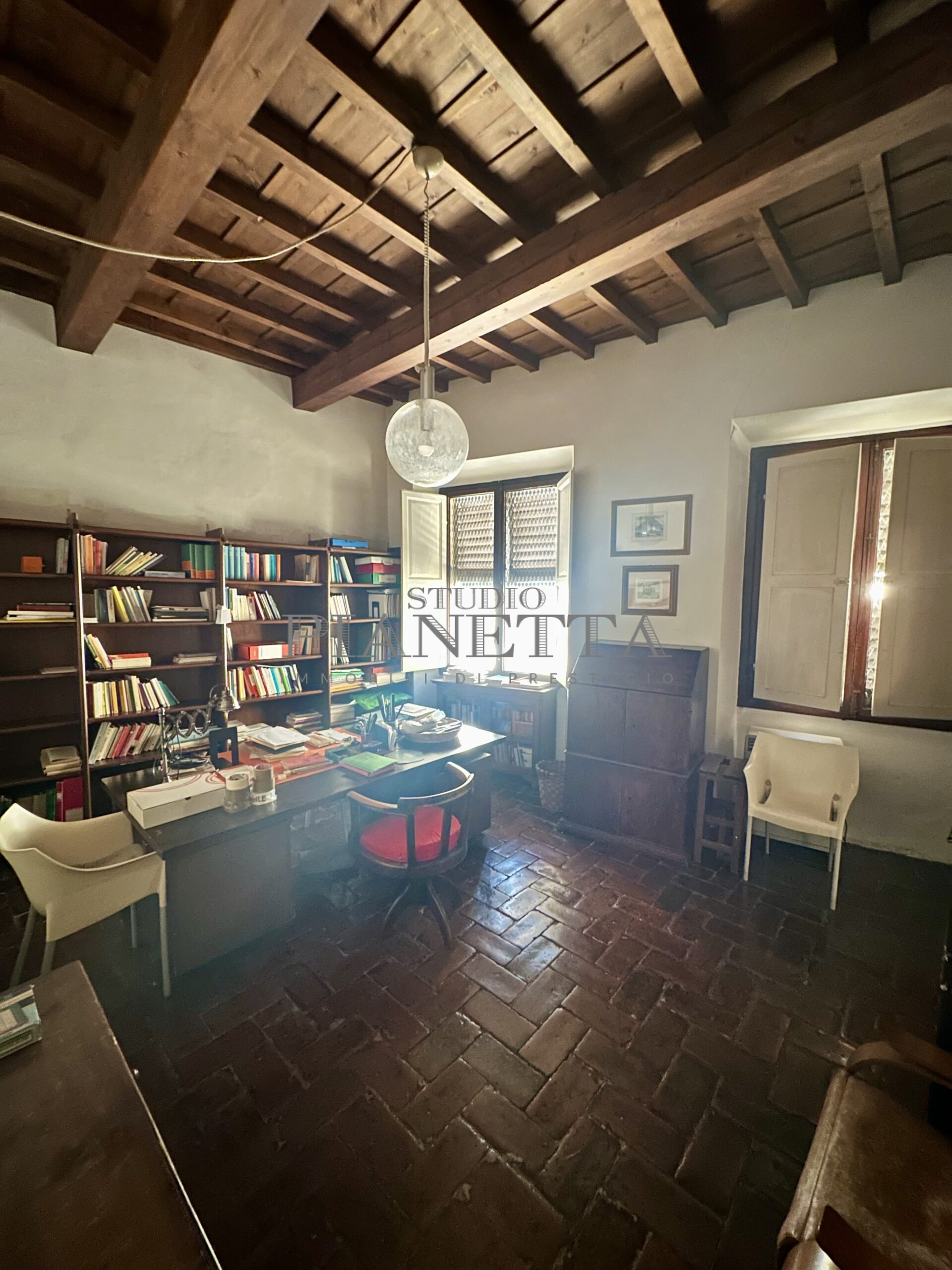 Oltrarno, in palazzo della Firenze granducale appartenuto ad un famoso architetto mediceo, al secondo e ultimo piano senza ascensore con comode e larghe scale in pietra serena, con capitelli e colonne ornate, importante appartamento della grandezza di 200 mq circa distribuiti su tre livelli con triplo ingresso. Gli ambienti sono grandi, caratteristici, con cotto antico e antichi soffitti a cassettoni. I salotti sono tre di cui due attualmente adibiti a grandi studi ma convertibili in camere, una piccola e intima sala da pranzo, una cucina e un bagno. Al piano mezzanino si trova un’ulteriore camera indipendente con accesso separato, mentre ad un altro ampio vano di passaggio si accede al piano superiore dove troviamo due camere da letto matrimoniali e un bagno en suite. L’appartamento e’ corredato anche da una grande soffitta praticabile. L’appartamento si presenta in buone condizioni di manutenzione.