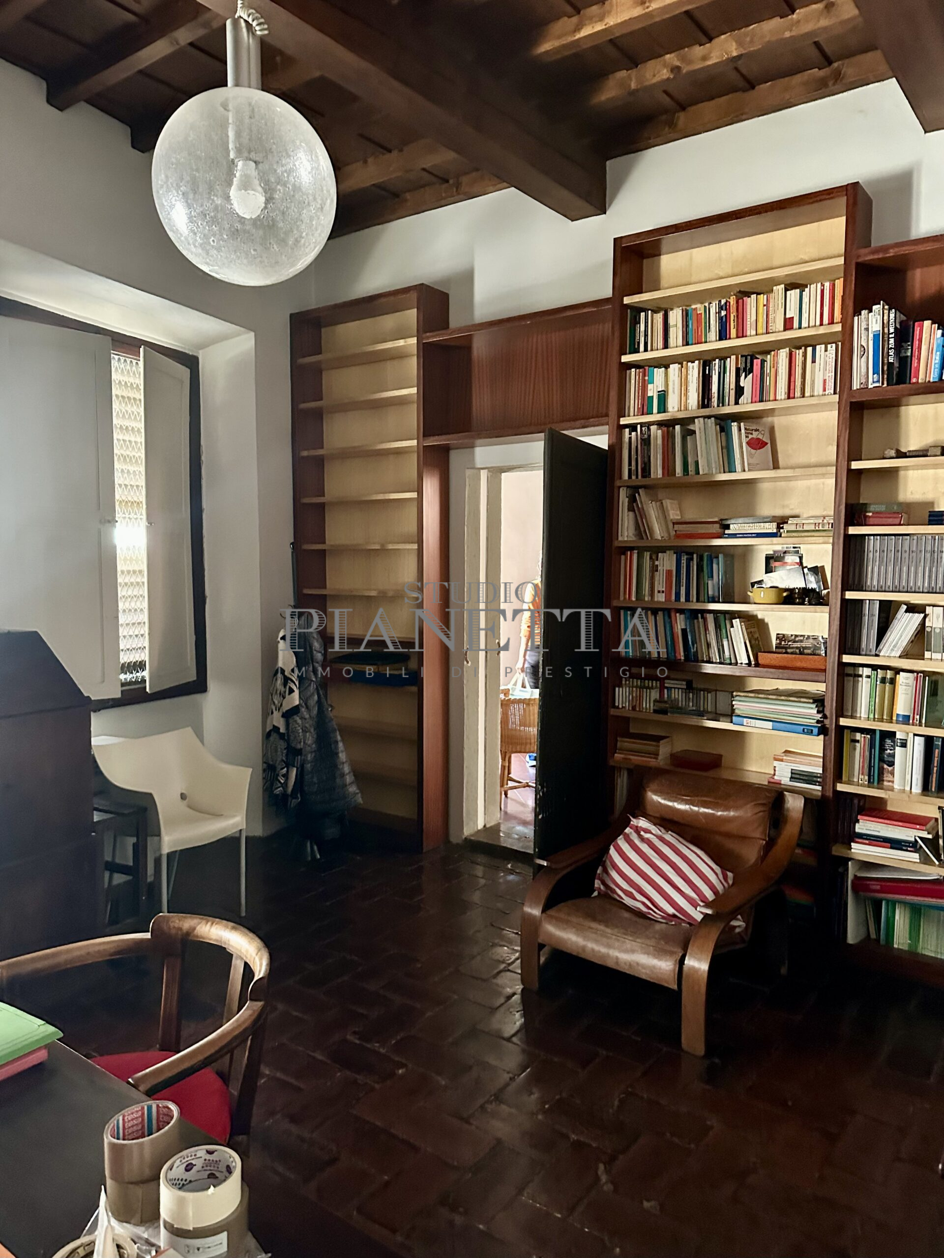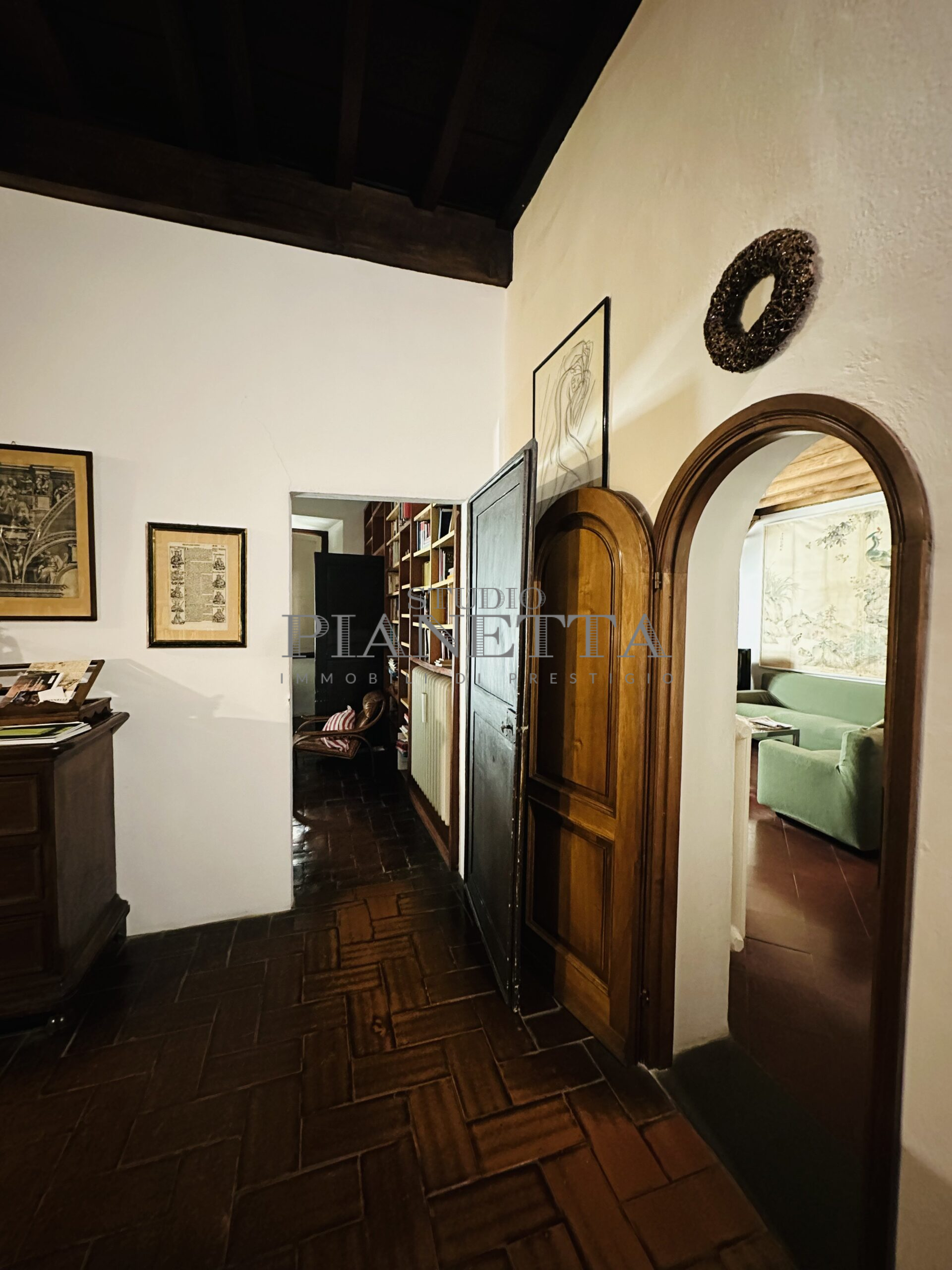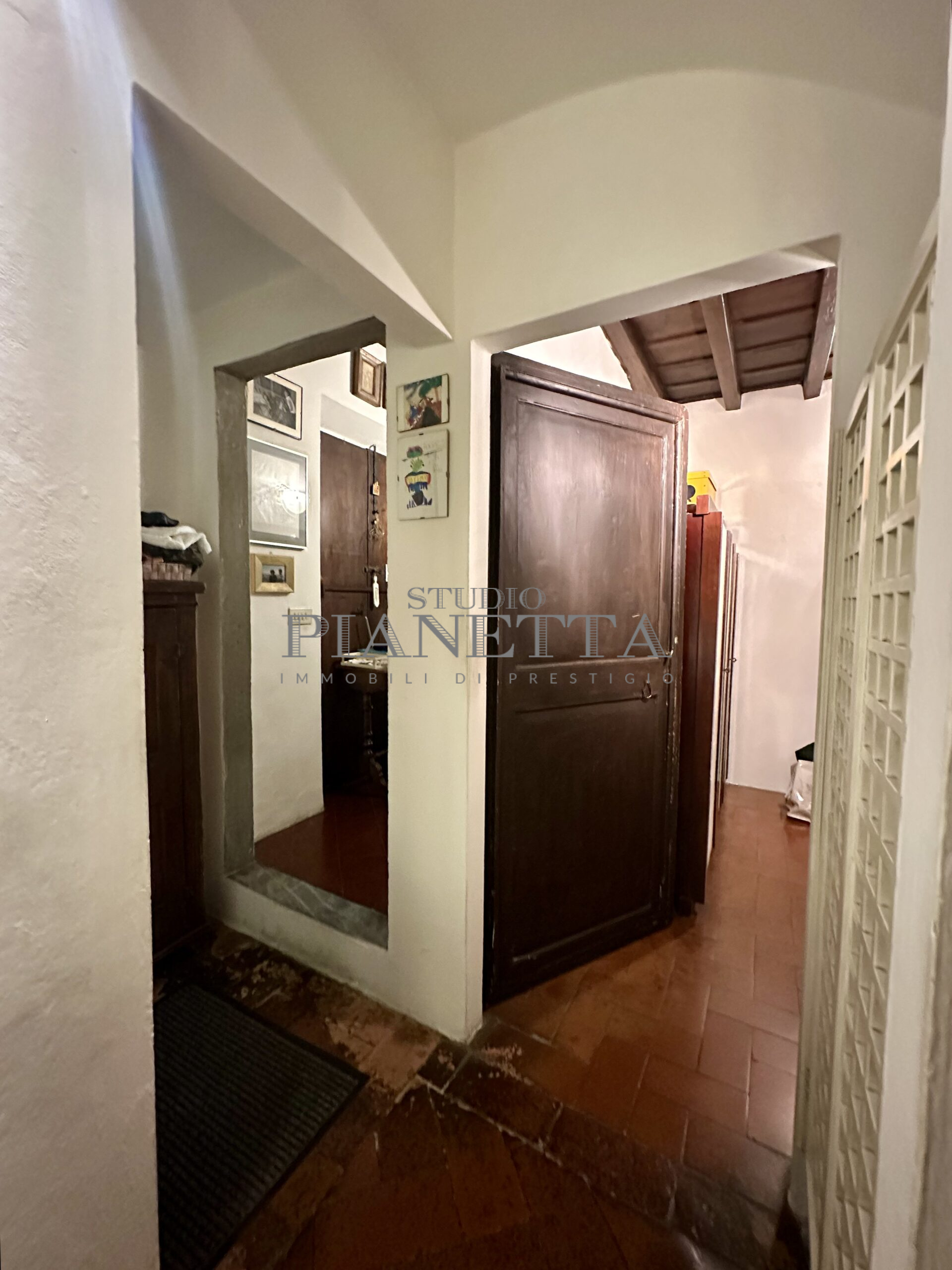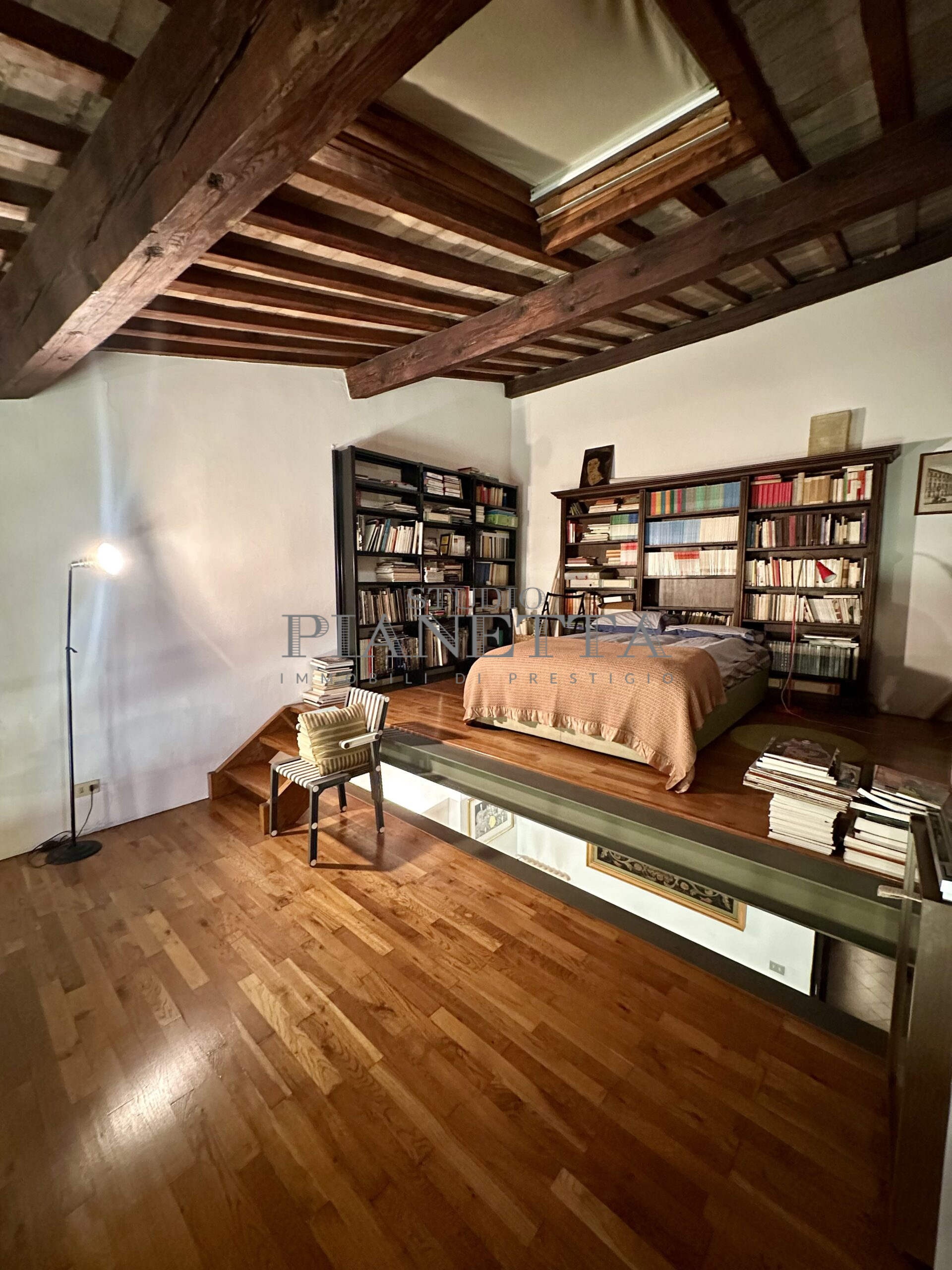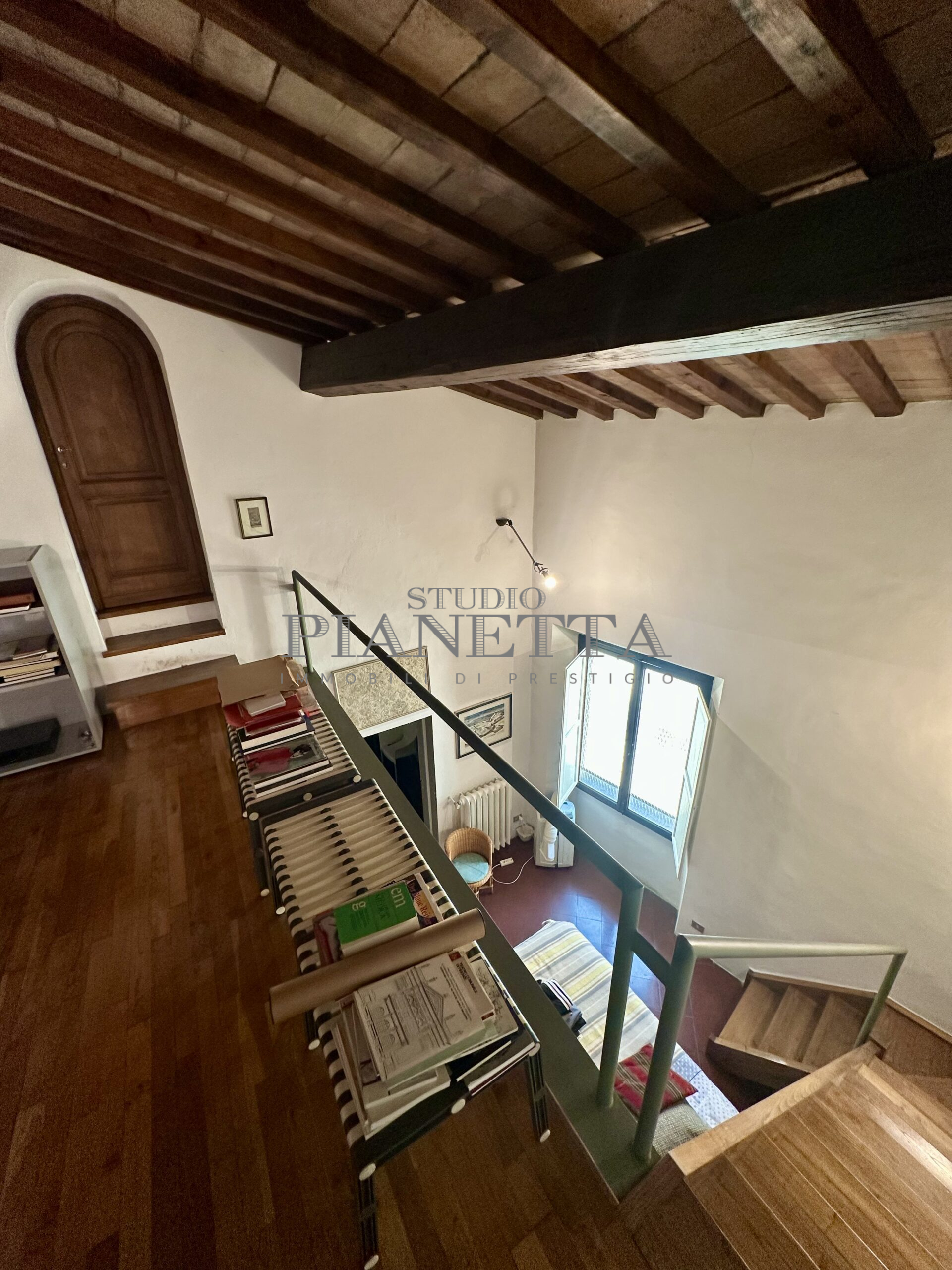 Oltrarno, in palazzo della Firenze granducale appartenuto ad un famoso architetto mediceo, al secondo e ultimo piano senza ascensore con comode e larghe scale in pietra serena, con capitelli e colonne ornate, importante appartamento della grandezza di 200 mq circa distribuiti su tre livelli con triplo ingresso. Gli ambienti sono grandi, caratteristici, con cotto antico e antichi soffitti a cassettoni. I salotti sono tre di cui due attualmente adibiti a grandi studi ma convertibili in camere, una piccola e intima sala da pranzo, una cucina e un bagno. Al piano mezzanino si trova un’ulteriore camera indipendente con accesso separato, mentre ad un altro ampio vano di passaggio si accede al piano superiore dove troviamo due camere da letto matrimoniali e un bagno en suite. L’appartamento e’ corredato anche da una grande soffitta praticabile. L’appartamento si presenta in buone condizioni di manutenzione.